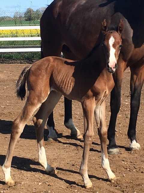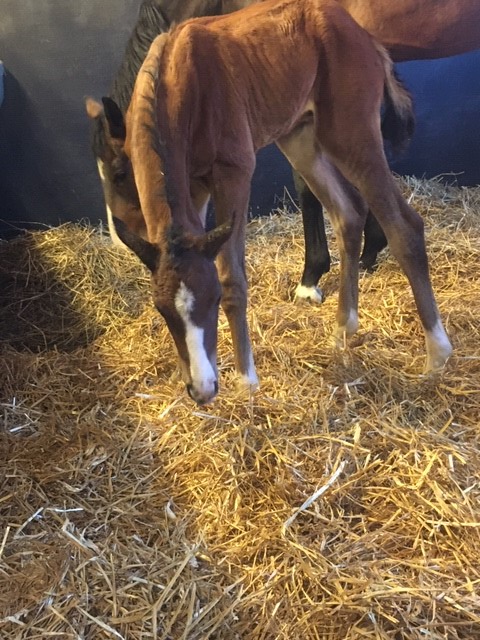 Den 11 maj föddes så äntligen den första fölungen. Det blev Gigantine som fölade på natten och allt gick bra. Det är ett hingstföl efter hingsten Suarez som i sin tur är son till Sezuan den otroliga hingsten som vann Unghäst VM både som 5,6,och 7 åring. Morfar till Suarez är Desperados som tävlat mycket och bla. tog individuellt OS-silver i Rio.