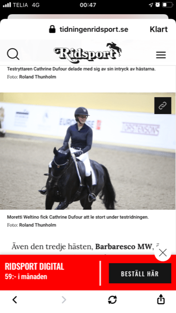 Cathrine Dufour höjde Moretti till skyarna för hans fantastiska ridegenskaper och följsamhet. Hon gav honom 90 procent av 100 på ridbarhet!!