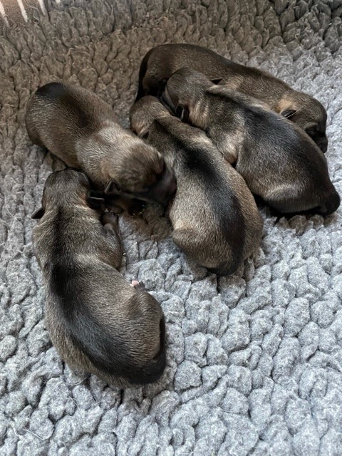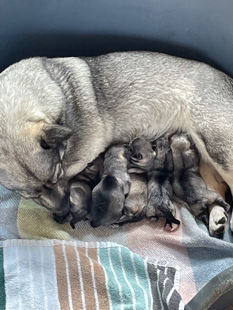 I går mitt på dagen valpade Heidi. Det gick lugnt och stilla, och efter några timmar hade vi fem stycken nya små liv i korgen. Det blev två tikvalpar och tre hanar. De är jämnstora och ser ut att må väldigt gott. Heidi är hos de små så gott som hela tiden så det är full tankning med mjölk. En första bild på underverken kommer nedan.