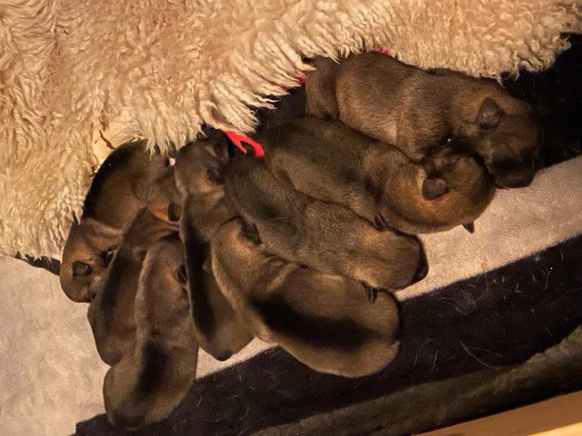 Natten mellan måndag och tisdag i denna veckan så valpade Heidi.Det blev en lång natt men till slut kunde vi andas ut och en helt slutkörd Heidi vila. Det är en stor kull på 8 stycken valpar. Det är blandat med svansar och stubb. Två tikar är stubbsvansade, en tik har lång svans. En hanhund har stubbsvans och de andra fyra har lång svans. Det har nu gått ett par dagar och både Heidi och valparna har acklimatiserat sig och jag tror de skall klara sig hela gänget. Med Heidi är det inga problem men valparnas första dygn är alltid kritiska. Vi är så glada och Heidi är väldigt duktig med småknoddarna.